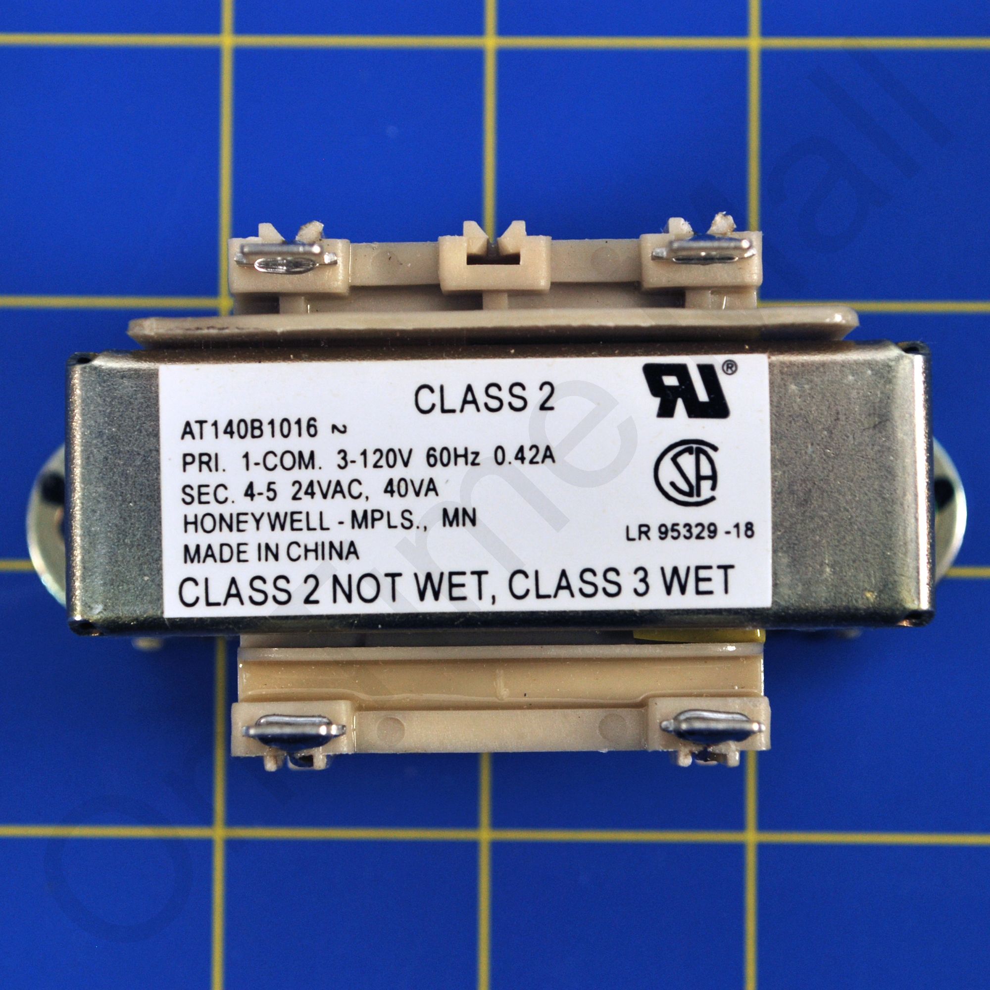 Honeywell AT140B1016 Foot Mounted Transformer. Provide power to 24 Vac circuits in heating/cooling control systems. Intended for use in systems with predictable, uniform loads. Can be used in any application that does not exceed the listed ratings. Color-coded leadwires for primary connections and screw terminals for secondary connections, fixed 1/4 inch (6 mm) male quick-connects or color-coded leadwires for both primary and secondary, are standard. Meet NEC Class 2 requirements. Meet Underwriters Laboratories Inc. Standard UL 1585 and are identified. Class 2 not wet, Class 3 wet.