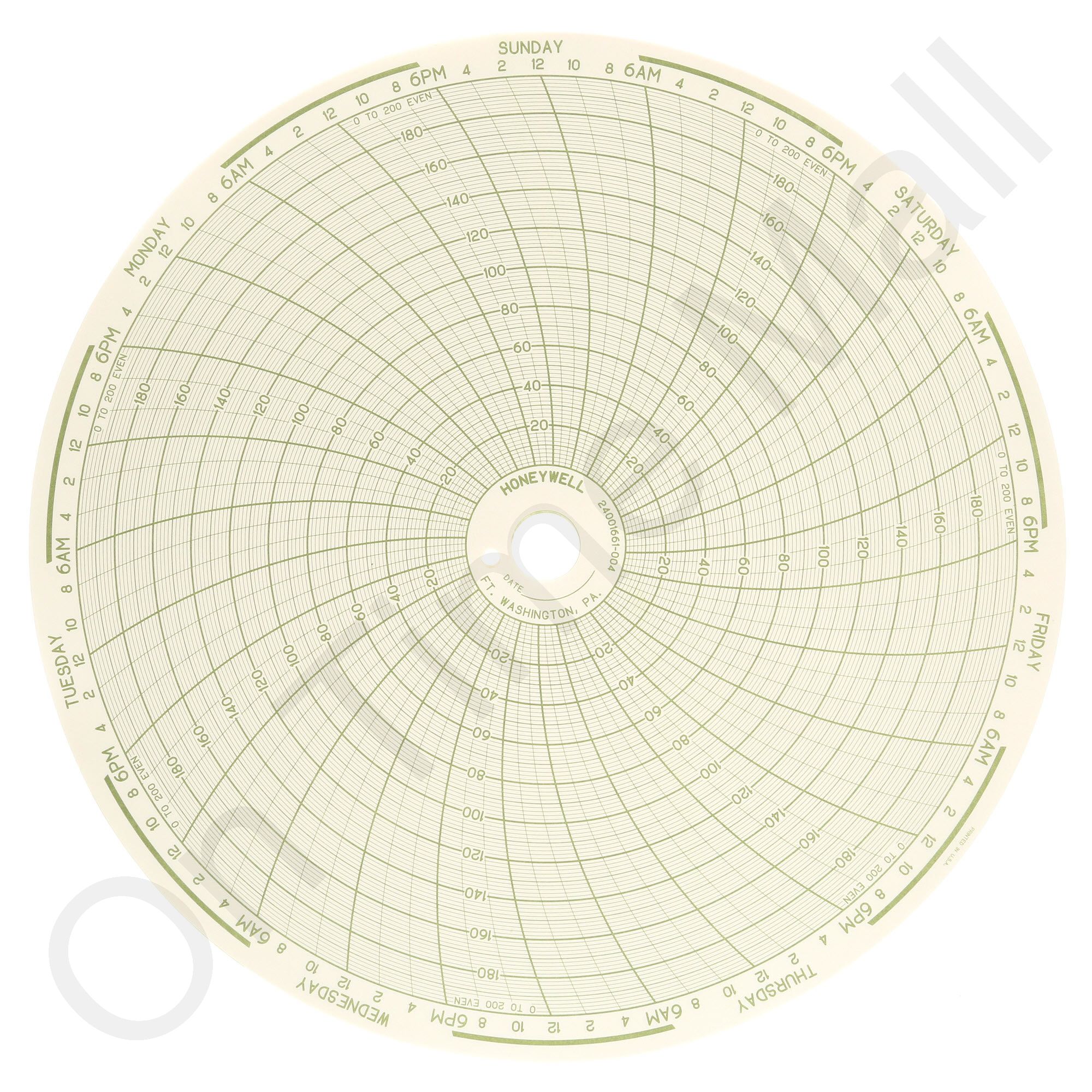 Replacement 10-round circular charts for the Honeywell industrial chart recorder. The package contains 100 circular charts. 0 to 200 range on a 7-day chart. Also known as part 0078693, 24001661-004, and 24001661-004 BN.