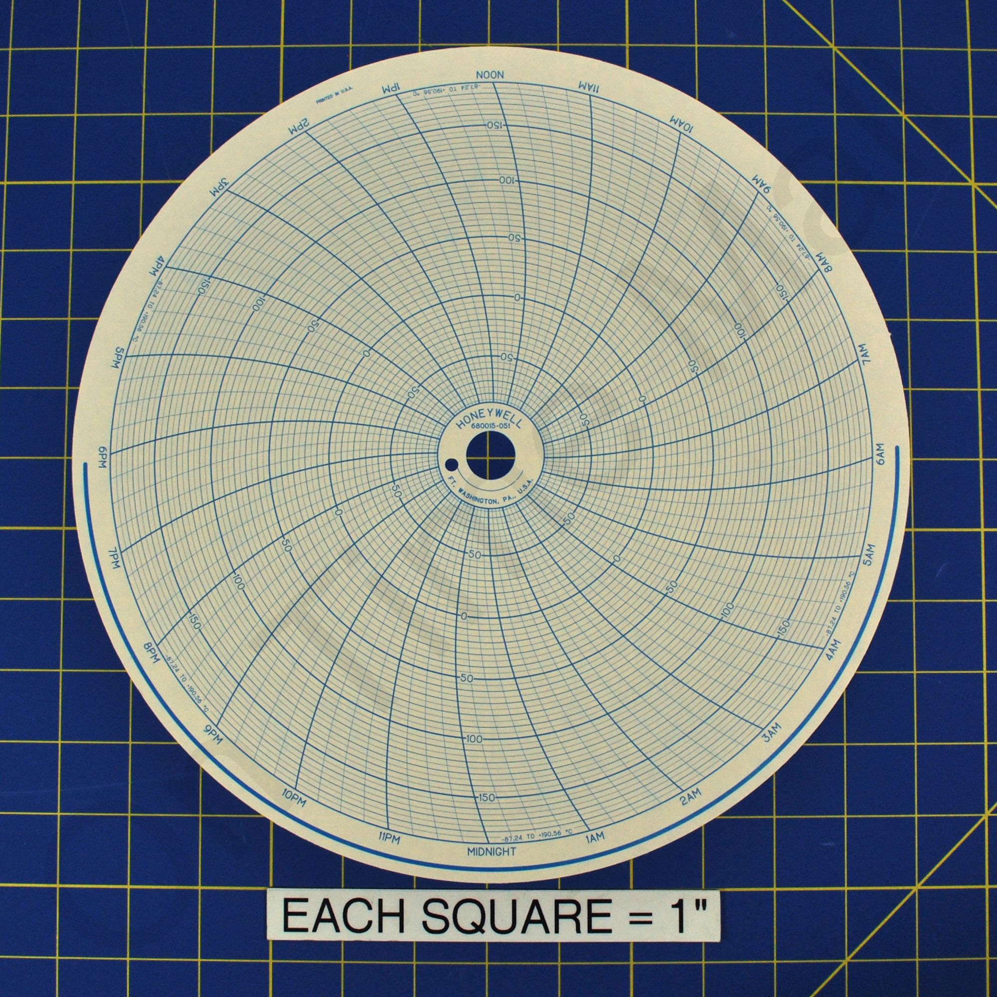 Replacement 12 inch round circular charts for Honeywell industrial chart recorder. Package contains 100 circular charts. Note: This chart is the same as 16484, but the color and timing font size is different.
