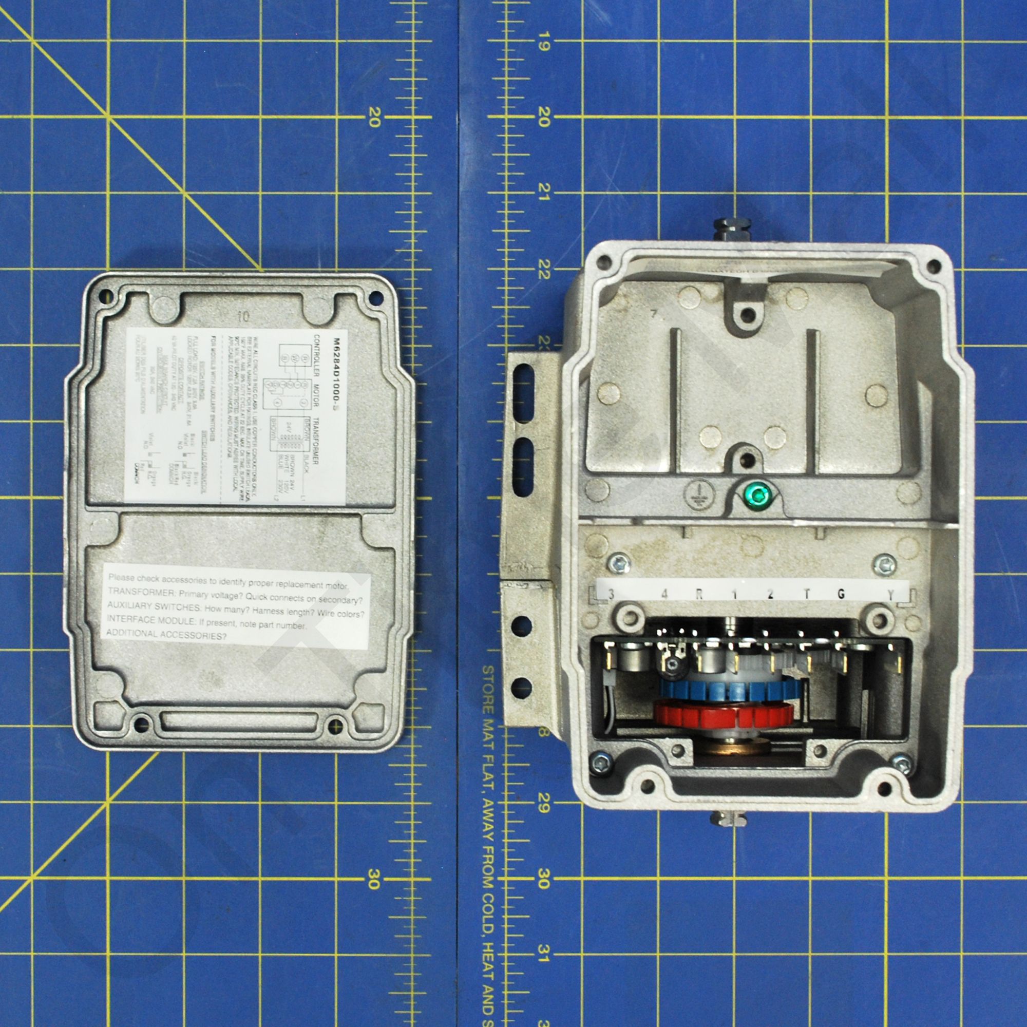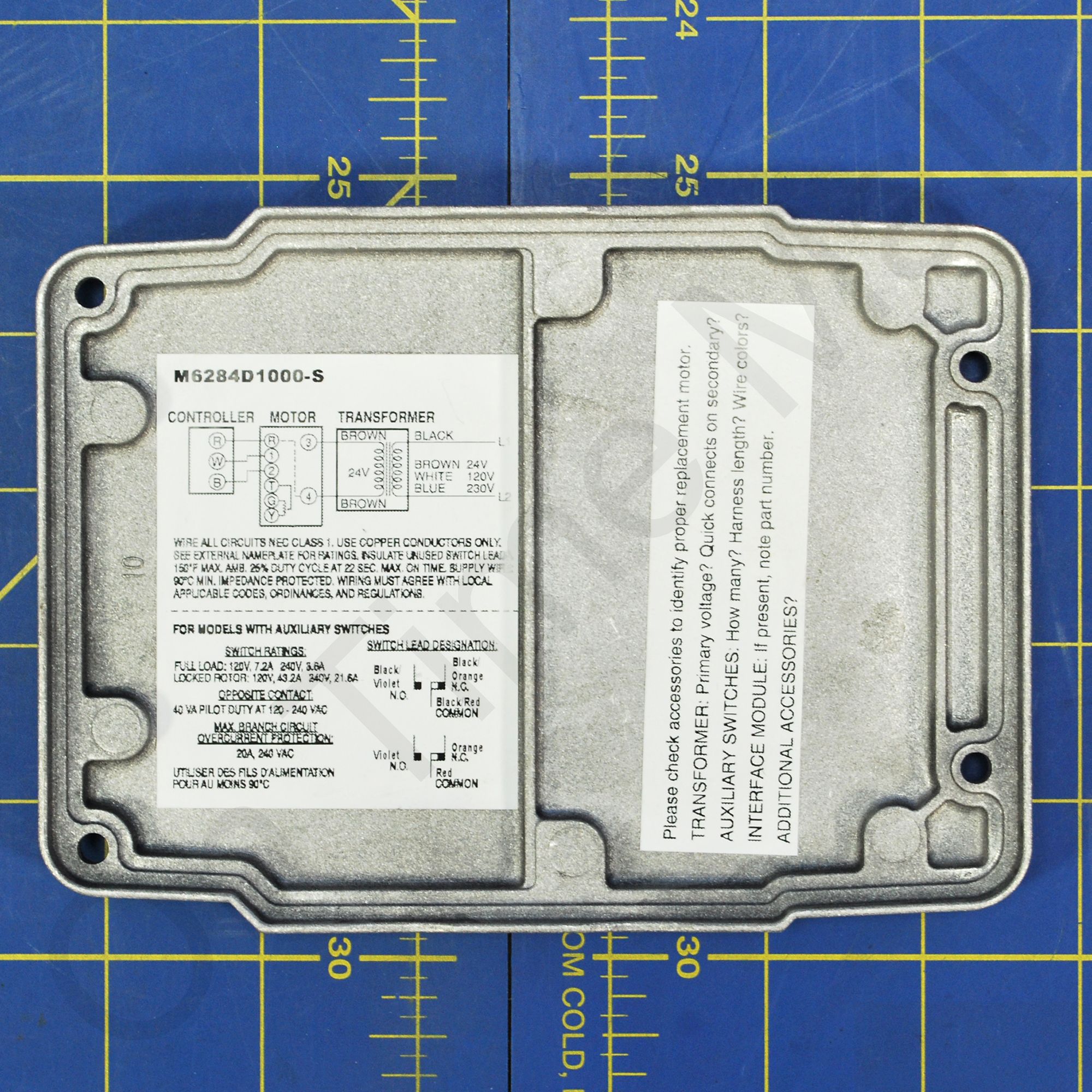 Honeywell M6284D1000-S Floating Control Motor. These Series 62 Modutrol IV™ Motors non-spring return floating control motors are used with controllers that provide a switched spdt or floating output to operate dampers or valves. These motors also have an internal electrically isolated feedback potentiometer that provides indication of the motor shaft position. Some models can be used for slaving Series 90 Motors. Replaces part M944B4005. Integral junction box provides NEMA 3 weather protection if motor is mounted in the upright position. Motor and circuitry operate from 24 Vac. Quick-connect terminals are standard--screw terminal adapter is available. Adapter bracket for matching shaft height of older motors is available. Motors have field adjustable stroke (90 to 160 degrees). Integral auxiliary switches are available factory mounted, or can be field added. All models have dual shafts (slotted and tapped on both ends). All models have auxiliary switch cams. Fixed torque throughout the entire voltage range. Motors are designed for either normally open or normally closed valves and dampers. Include electrically isolated feedback potentiometer that provides shaft position indication. -S models with non-linear feedback are for slaving applications only. Note: This item is a functional replacement for M6284D1000.