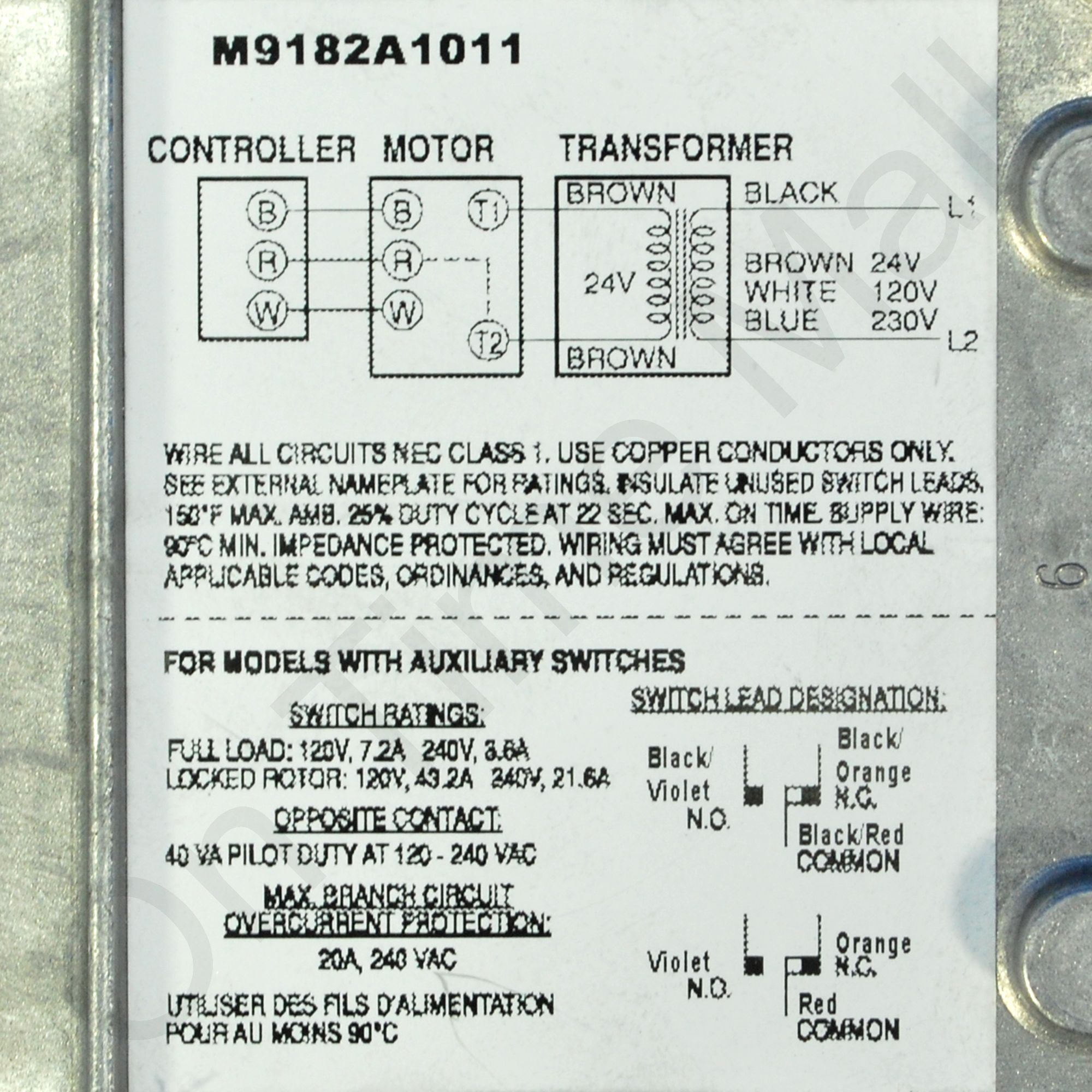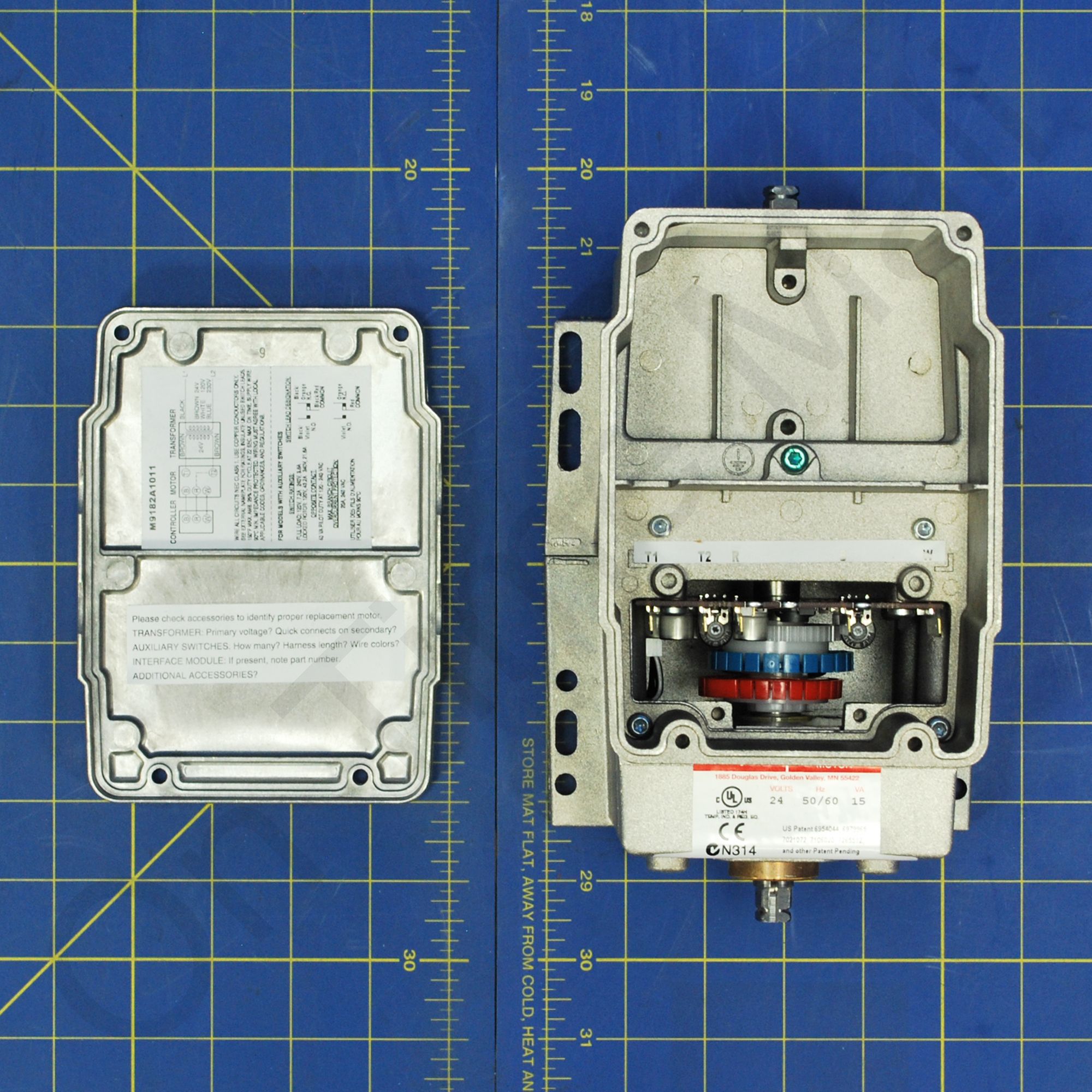 Honeywell M9182A1011 Spring Return Foot Mounted Actuator. Series 90 Modutrol IV Motors spring return modulating proportional control motors used with controllers that provide a Series 90 output to operate dampers or valves. Integral junction box provides NEMA 3 weather protection if motor is mounted in the upright position. Integral spring return returns motor to normal position in the event of power failure. Motor and circuitry operate from 24 Vac. Quick-connect terminals are standard; screw terminal adapter is available. Adapter bracket for matching shaft height of older motors is available. Motors have field adjustable stroke (90 to 160 degrees). Integral auxiliary switches are available factory mounted, or can be field added. Spring return motors can operate valve linkages from power end or auxiliary end shafts for normally closed or normally open valve applications. All models have dual shafts (slotted and tapped on both ends). All models have auxiliary switch cams. Fixed torque throughout the entire voltage range.
